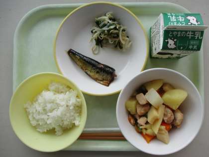 今日の献立は、塩ナムル、イワシのうめ煮、鶏肉と野菜のうま煮、ご飯、牛乳です。