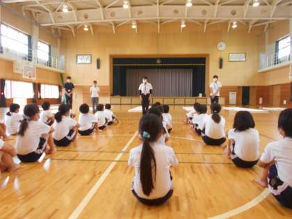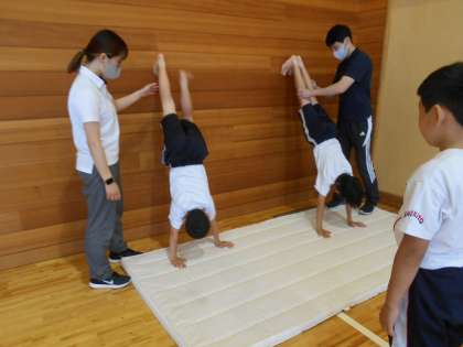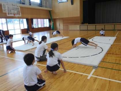 スポーツ指導員の方から、マット運動の前転・後転・側方倒立回転につながる動きを教えていただきました。子供たちは、たくさんのアドバイスをもらい、上達できた、楽しかったと答えていました。