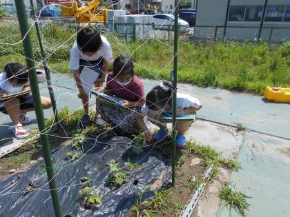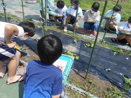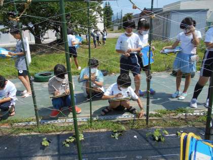 春から育てているヘチマの観察をしている様子です。畑に植え替えてからは、交代で水やりをしています。