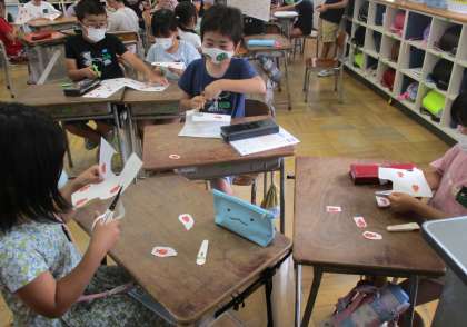 算数科「3けたの数」では、国語科で学習した「スイミー」に登場した赤い魚たちの数を協力して数えました。「10のまとまり」を生かして数えればよいことに気付き、100より大きい数を学習することができました。