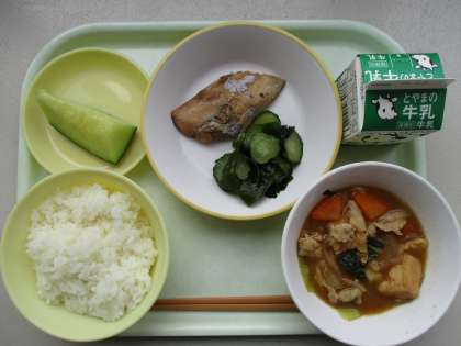 今日の献立は、さわらの幽庵やき、酢の物、厚揚げのみそ炒め、ご飯、牛乳、メロンです。