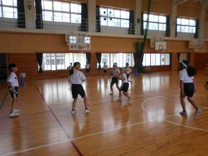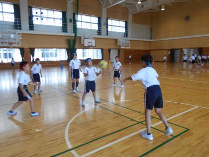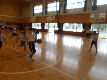体育では、「ポートボール」というバスケットボールにつながる競技に取り組んでいます。チームでメンバーや作戦をたてて、今日は1組対2組で試合をしました。