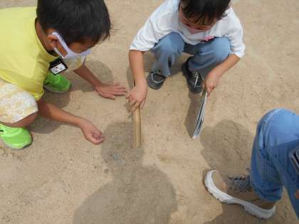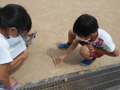 理科の学習で、水たまりができていた地面の傾きを調べている様子です。