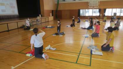 これから始まるプールでの学習に向けて、子供たちが安全に活動できるように日本赤十字社救急法指導員から心肺蘇生法を学んでいる先生たちです。