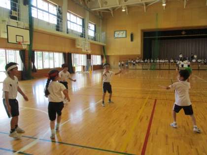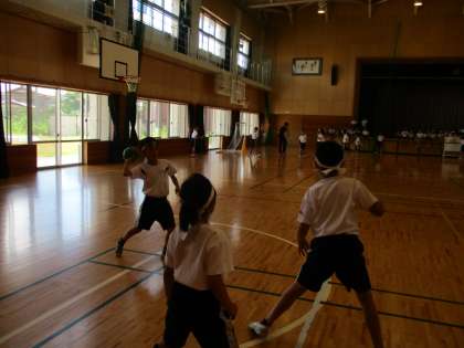 体育科では、ハンドボールのようなゲームをしています。自分たちで作戦を考え、より多くの得点を入れようと熱心に取り組んでいます。子供たちの様子です。