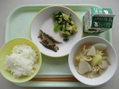今日の献立は、子アジの唐揚げ、チンゲンサイひたし、豚汁、ご飯、牛乳です。