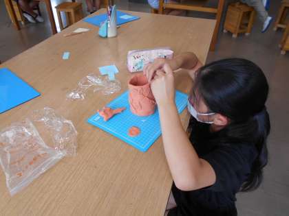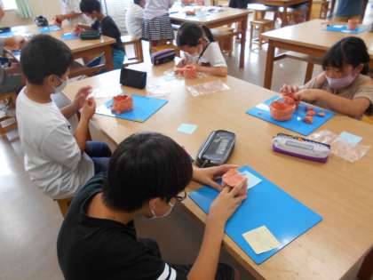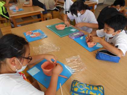 図工の学習では、粘土を使った小物入れを作っています。子供たちは、それぞれの思い描く小物入れになるように、熱心に作品づくりに取り組みました。