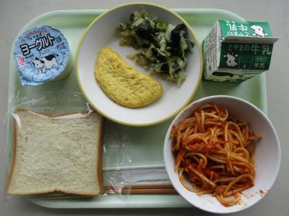 今日の献立は、ツナとトマトのスパゲッティ、海藻サラダ、オムレツ、食パン、ヨーグルト、牛乳です。
