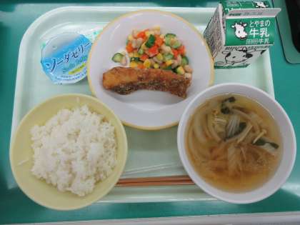 今日の献立は選択制で、魚のカレー揚げ(またはハムチーズフライ)、甘味噌和え、ご飯、具だくさん汁、牛乳、ソーダゼリー(またはシークワーサータルト)です。