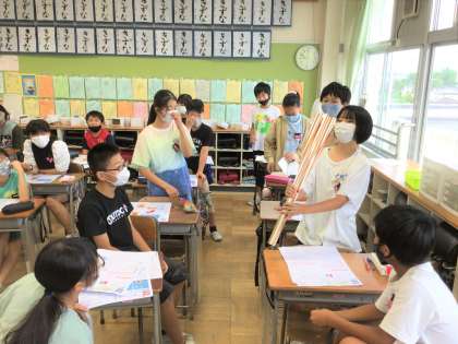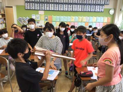 聖火ランナーを務められた方からお借りした聖火リレーのトーチを、みんな順番に持たせてもらいました。みんな、その構造に興味津々でした。