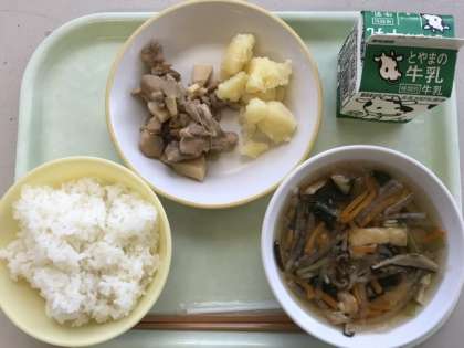 今日の献立は、粉ふき芋、あっさりチキン、沢煮椀、ごはん、牛乳です。