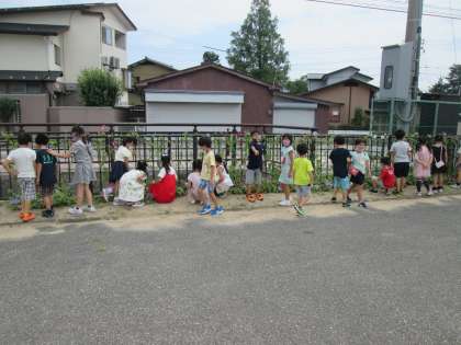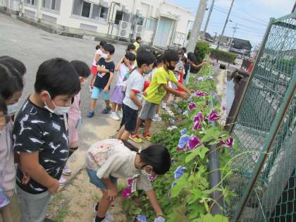 間引きをしたアサガオがぐんぐん育ち、いろいろな色の花を咲かせました。子供たちもうれしそうです。