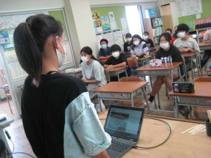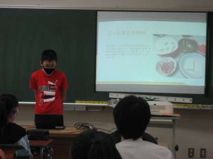 1学期の「炒めてつくる料理」の学習を生かして、夏休み中に実践した朝食づくりについて発表しました。一人一台端末を活用して、作り方の説明や完成した料理の写真を挿入して一人一人が「スライド」を作成し、発表しました。