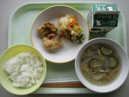 今日の献立は、鶏肉の米粉あげ、コーンスローサラダ、茄子の味噌汁、ご飯、牛乳です。