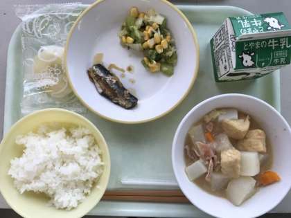今日の献立は、コーン和え、鰯の生姜味、大根の味噌煮込み、ご飯、牛乳、冷凍パインです。