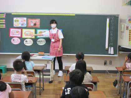 実習生の大石先生が教室へ来て、食品の働きを教えてくださいました。