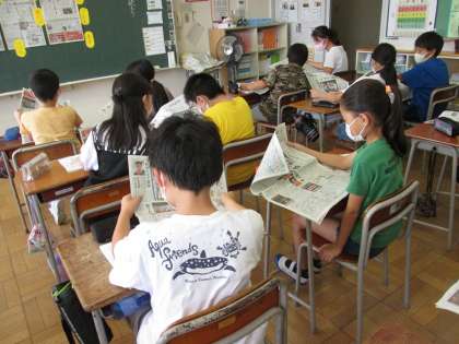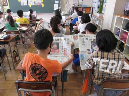 「新聞を読もう」の学習では、新聞の一面から、新聞構成の工夫や全国紙と地方紙の記事の違いを見付けています。同じ人物や出来事を取り上げていても書かれている内容が、地方紙の新聞の方が、地域に密着していてより詳しく書かれていることに気付いていました。