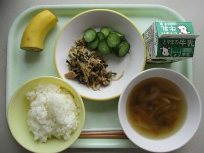 今日の献立は、豚肉のキムチ炒め、キュウリもみ、茎ワカメのスープ、ご飯、牛乳、バナナです。