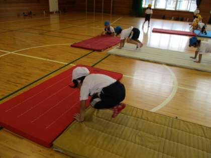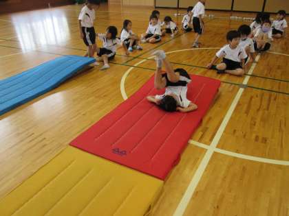 体育ではマットあそびに取り組んでいます。今日は、ネコちゃん体操や動物歩き、前転がり、後ろ転がりなど、いろいろな動きに挑戦しました。