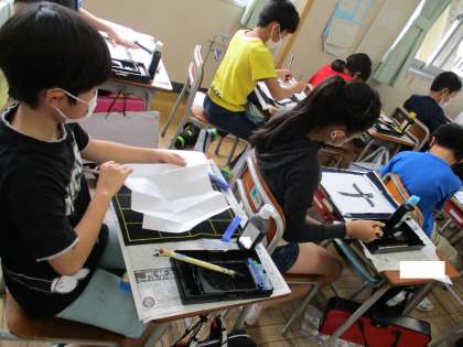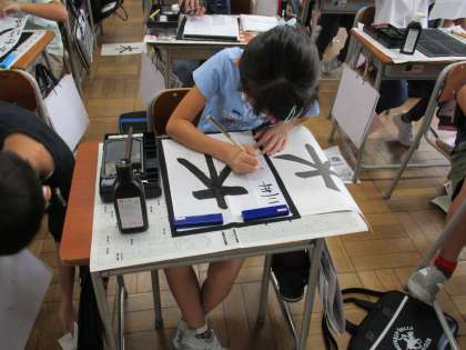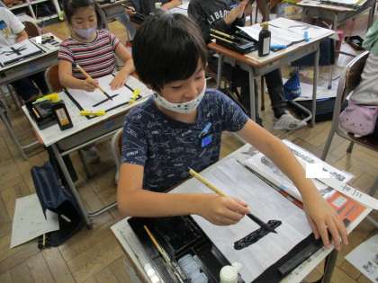 書写では、はらいの筆遣いに気を付けながら「木」を書きました。線の太さの変化を考えながら真剣に取り組む子供たちの様子です。