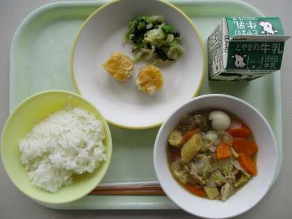 今日の献立は、八宝菜、にんじんシューマイ、小松菜ひたし、ご飯、牛乳です。