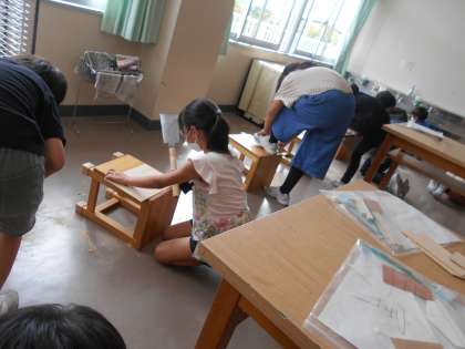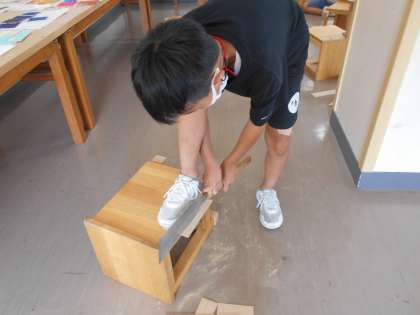 図画工作科では、のこぎりの使い方を学習しています。板をいろいろな形に切って、壁掛けを作成しています。