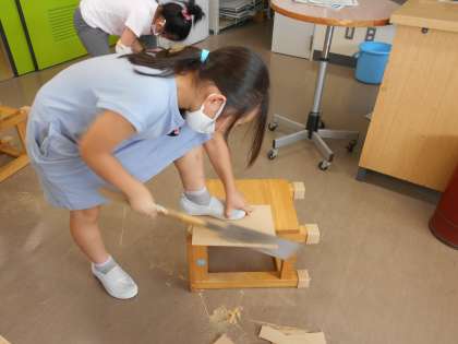図画工作科では、のこぎりの使い方を学習しています。板をいろいろな形に切って、壁掛けを作成しています。