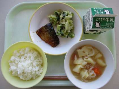 今日の献立は、さばのみりん焼き、おひたし、南蛮煮、ご飯、牛乳です。