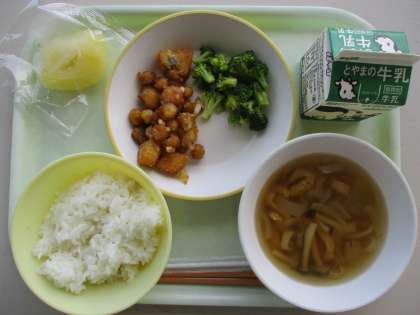 今日の献立は、魚とひよこ豆の甘からめ、ゆでブロッコリー、すまし汁、冷凍リンゴ、ご飯、牛乳です。