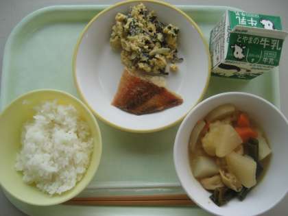 今日の献立は、赤魚の塩焼き、たまごとキクラゲの炒め物、炊き合わせ、ごはん、牛乳です。