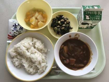 今日の献立は、食べキリンハヤシ、大豆とひじきのサラダ、味付け小魚、麦ごはん、牛乳、フルーツゼリーミックスです。
