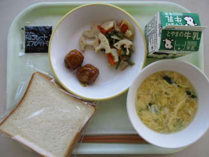 今日の献立は、ミートボールの照り焼き、蓮根ソテー、卵コーンスープ、食パン、チョコレートクリーム、牛乳です。
