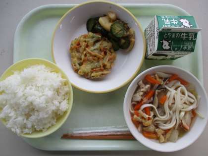 今日の献立は、かしわうどん、えごま入りかきあげ、こんぶ和え、しそかつおふりかけ、ご飯、牛乳です。
