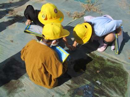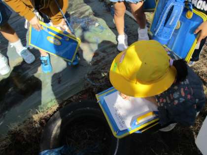 今日は学校のプール近くの原っぱで生き物見つけをしました。トンボやコオロギ、チョウ、カエルなどいろいろな生き物を見つけることができました。子供たちは、大きさや色、形、動きなどをよく観察して、観察カードに書き込んでいました。