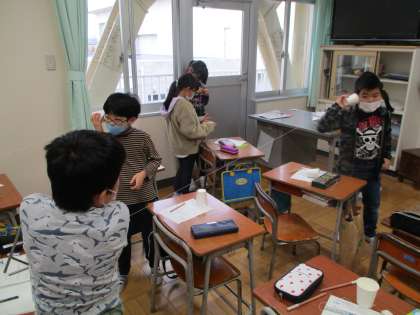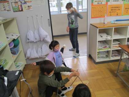 理科の実験で、紙コップと糸も用い、糸電話を作り、片方にトライアングルを結び付け、音が伝わるか、そして、音を鳴らしたとき、糸は震えているかを実験しました。班で協力して実験してみると、音が糸を通して伝わったこと、そして糸が震えていることに驚き、喜ぶ子供の姿が見られました。