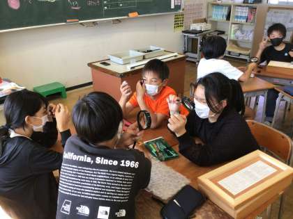 水のはたらきでできた地層の岩石と火山のはたらきでできた地層の岩石を比較しながら観察しました。ルーペを使って細かいところまで見て、様々な発見をしていました。