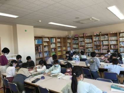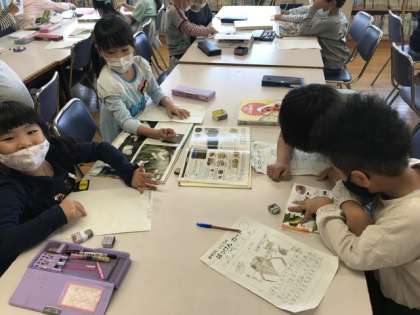 コオロギやトンボなど、学校の裏で見つけて観察した虫について、図書室の本で調べました。