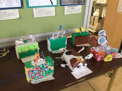 クランクをつかったおもちゃが完成し、廊下に展示しています。それぞれの力作を楽しみながら鑑賞しています。