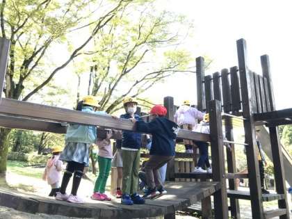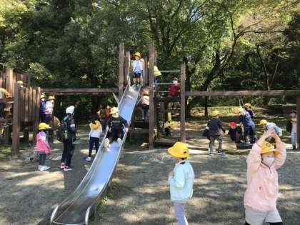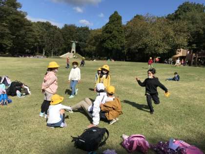 広場で休憩です。天気がよく、思い切り遊んでいます。