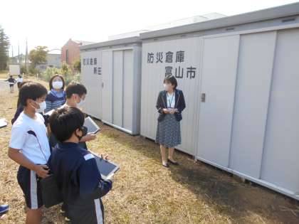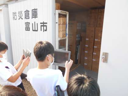 5年生は、防災をテーマに総合的な学習の時間に取り組んでいます。今日は、数名の子供たちが学校に設置してある防災倉庫の中の様子を見学しました。倉庫の中には、大量の非常食や毛布等が並んでいました。学校にはいざというときの備えがあることを確認できました。
