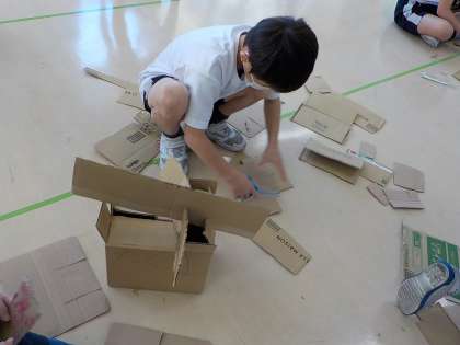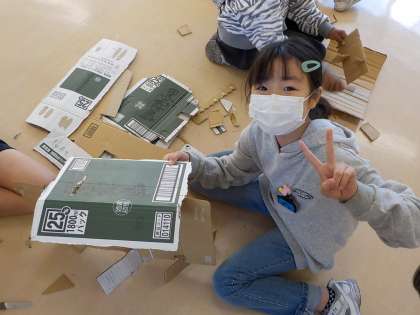 のりやテープを使わずに、段ボールに切り込みを入れて作品にしていきます。