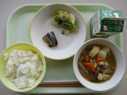 今日の献立は、筑前だき、さんまのマーマレード煮、生姜ひたし、ご飯、牛乳です。