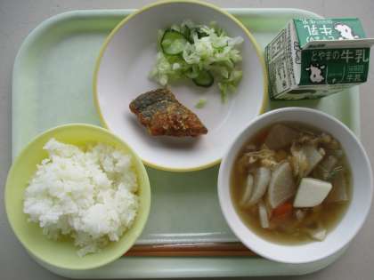 今日の献立は、魚の竜田揚げ、添え野菜、根菜汁、ご飯、牛乳です。