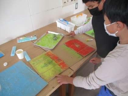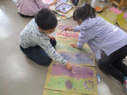 図画工作科の学習で、「ペタパタひらくと」の学習を行いました。段ボールを使い、切り開いた形に好きな色をローラーや筆で塗ったり、様々な道具を使ってスタンプを押したりしました。自由に色をつける活動では、友達と協力し、楽しそうに活動を行っていました。