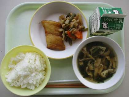今日の献立は、揚げ魚のレモン味、五目煮まめ、うすくず汁、ご飯、牛乳です。