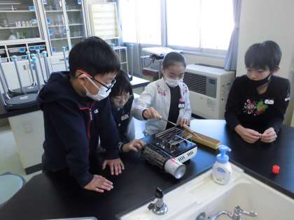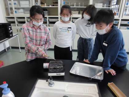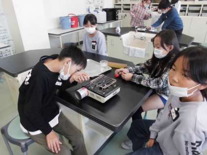 理科「金属の体積は変わるのだろうか?」の実験をしている様子です。