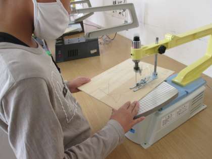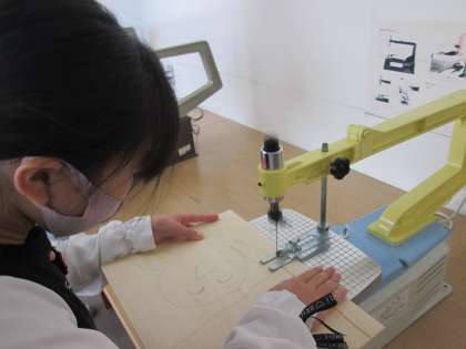 図画工作科の学習では、電動糸のこぎりを使って、板を切り、作品づくりをしています。