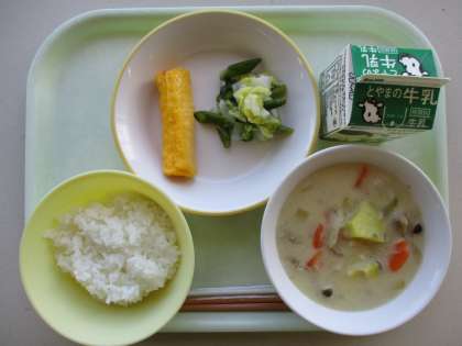 今日の献立は、秋の香りシチュー、たまごロール、フレンチサラダ、ご飯、牛乳です。