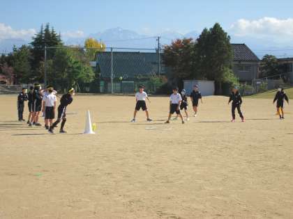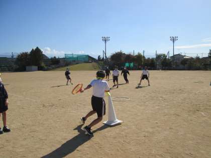 体育科では、「打って走って 守ってアウト!ベースボール」の学習を行っています。ベースボール型のボール運動は、ルールが複雑なので、できるだけ簡単に分かりやすくし、ゲームをしています。どこに打つか狙ったり、どこでアウトにするか考えたりするなど、子供たちはチームの仲間と声をかけ合っています。