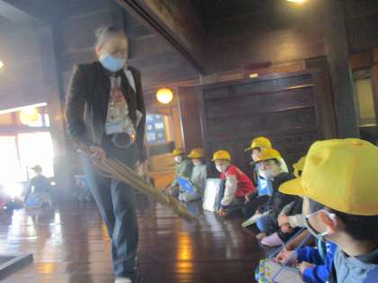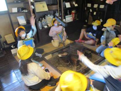 絶好の秋晴れの中、民俗民芸村へ校外学習に行きました。社会科で学習する昔の生活の様子や道具の移り変わりなどについて、実際に展示されている物を見せていただいたり、説明をしていただいたりしました。普段の生活では見ることのない昔の道具の数々に驚く子供の様子がたくさん見られました。